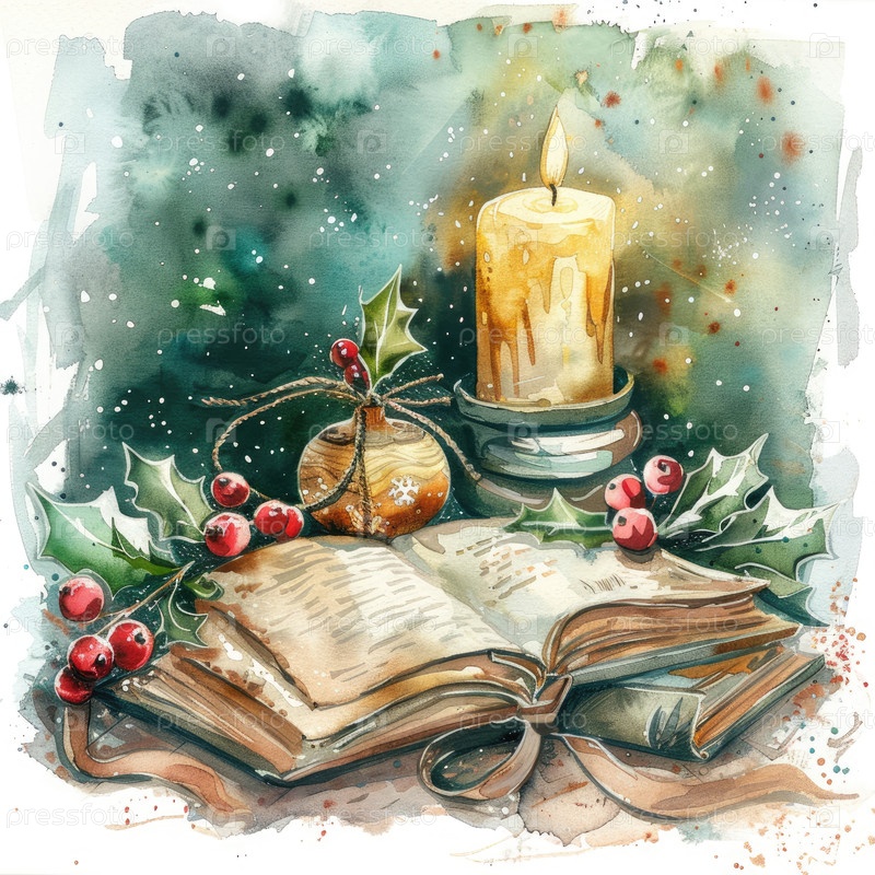 Акварельная иллюстрация открытой книги со свечой и праздничными украшениями для праздничной атмосферы