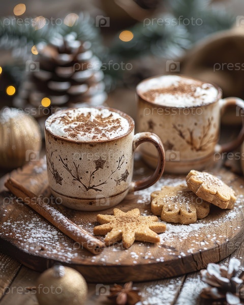 Теплые кружки горячего шоколада с печеньем на деревенском деревянном столе в окружении праздничных украшений
