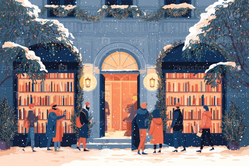 Зимняя сцена с разными людьми, просматривающими книги за уютным книжным магазином в снежной обстановке