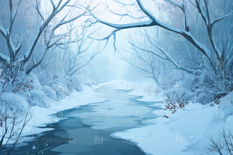 Зимний пейзаж с спокойной рекой, протекающей через заснеженные деревья и туман