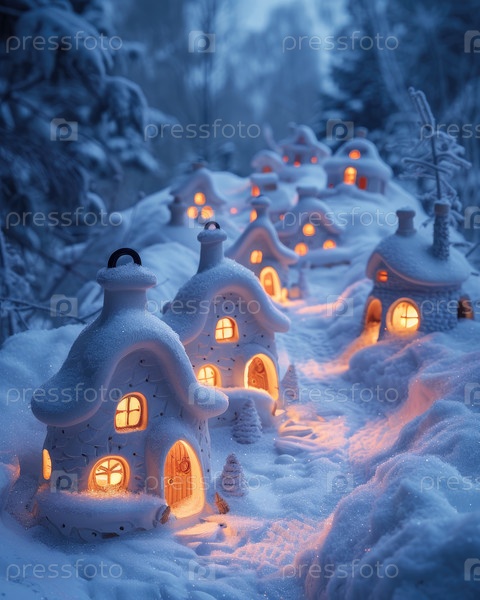 Зачарованная зимняя деревня с светящимися домами, окруженными снегом и деревьями на закате