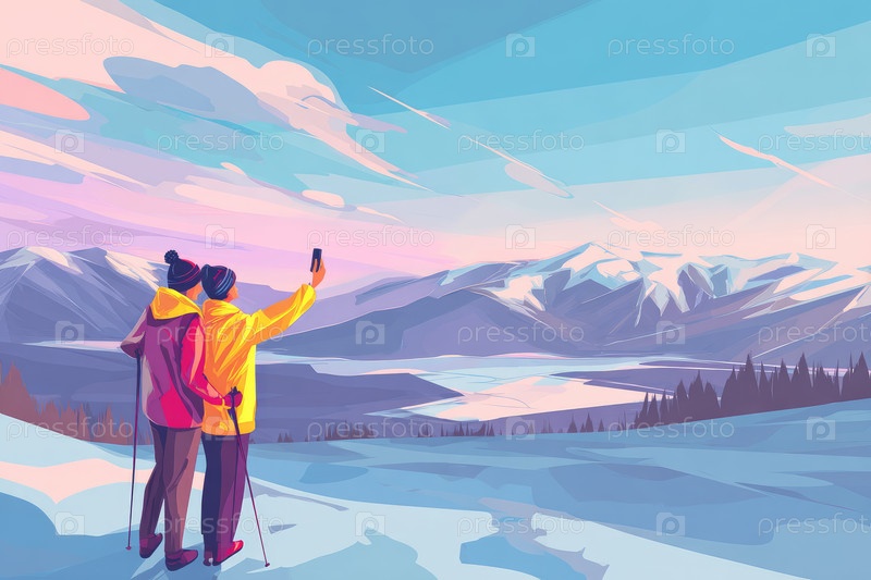 Два туриста делают селфи в заснеженных горах с яркими цветами и живописными пейзажами