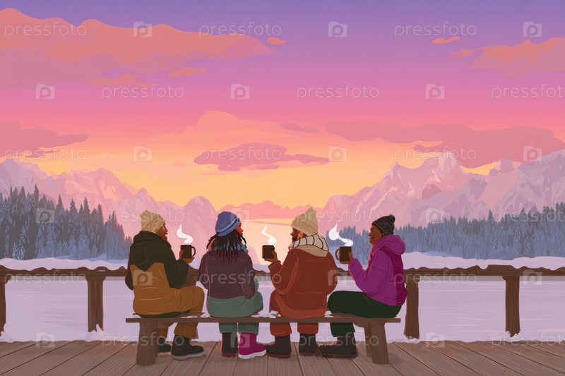 Группа друзей наслаждается горячими напитками, наблюдая за закатом солнца над снежными горами