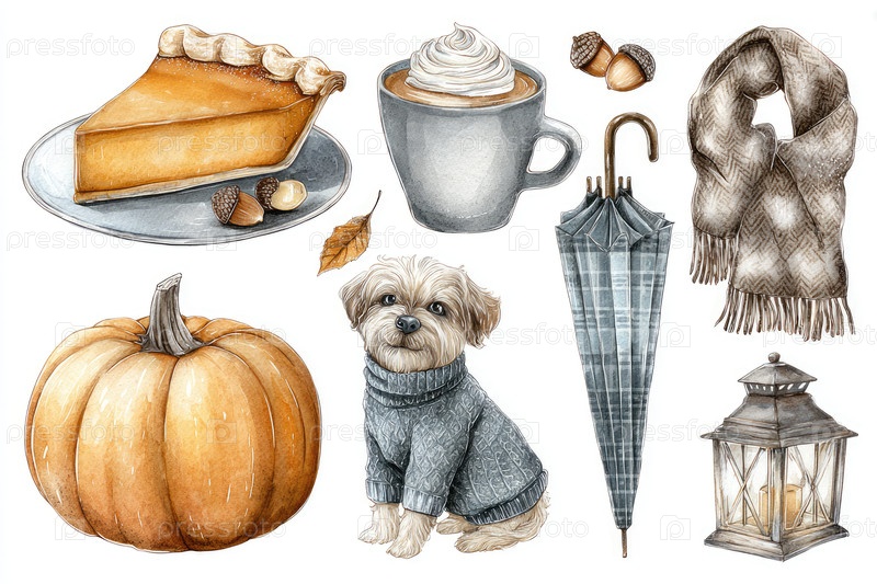 Акварель осенний hygge с зонтиком тыквенного пирога