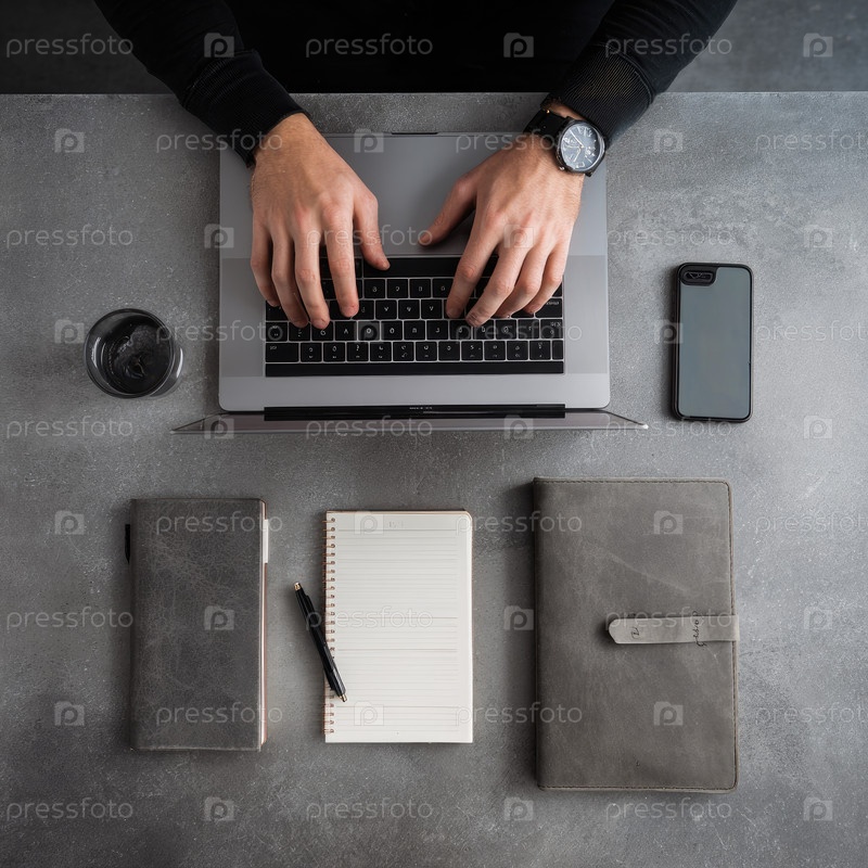 Мужчина-профессионал работает на ноутбуке за современным столом с ноутбуками и смартфоном поблизости