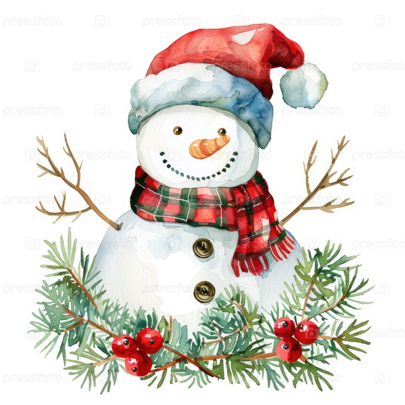 Веселый снеговик в красной шляпе и шарфе, окруженный праздничным зеленым и ягодами