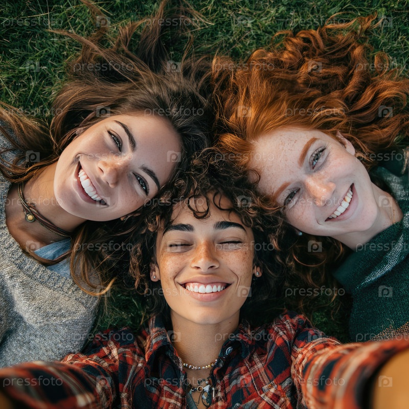 Три разных женщины улыбаются вместе на зеленой траве, наслаждаясь дружбой и общением на свежем воздухе