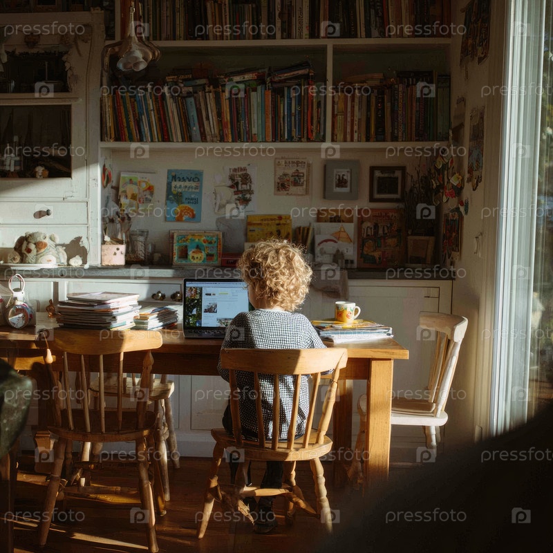 Мальчик с кудрявыми волосами сосредоточен на ноутбуке у уютного деревянного стола в светлой комнате