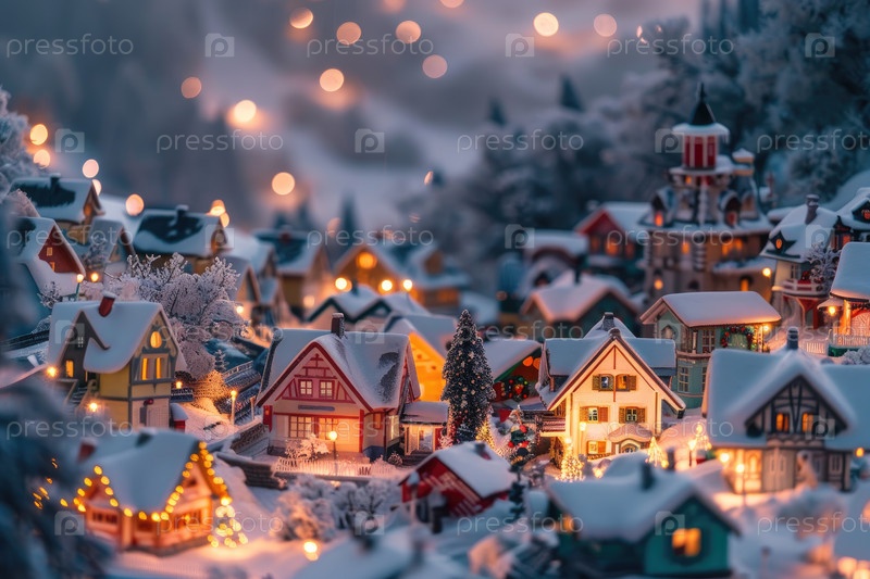 Миниатюрная сцена зимней деревни со снежными домами и теплыми светящимися огнями ночью
