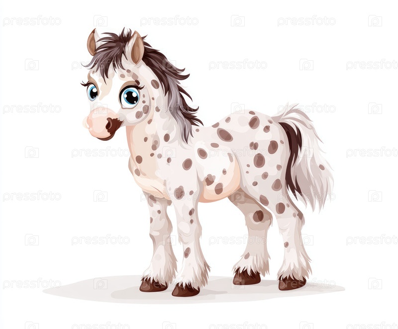 Очаровательная иллюстрация пятнистого пони с большими выразительными глазами и пушистой гривой, стоящей в игривой позе на чистом белом фоне, идеально подходит для детских рисунков и повествования
