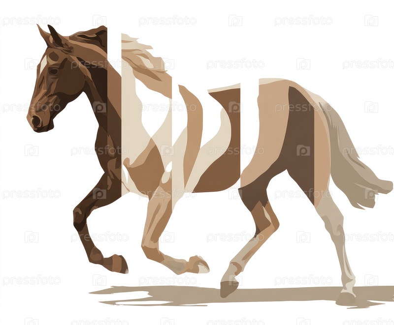 Динамическая иллюстрация лошади, изображенная в абстрактных геометрических формах, показывающих теплые земные тона и чувство движения, подчеркивая красоту и грацию движения и формы лошадей