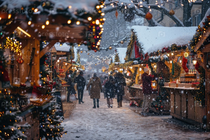Зимняя рыночная сцена заполнена праздничными украшениями и мерцающими огнями, когда снег медленно падает на посетителей, наслаждающихся праздничной атмосферой, создавая уютную и радостную обстановку для всех