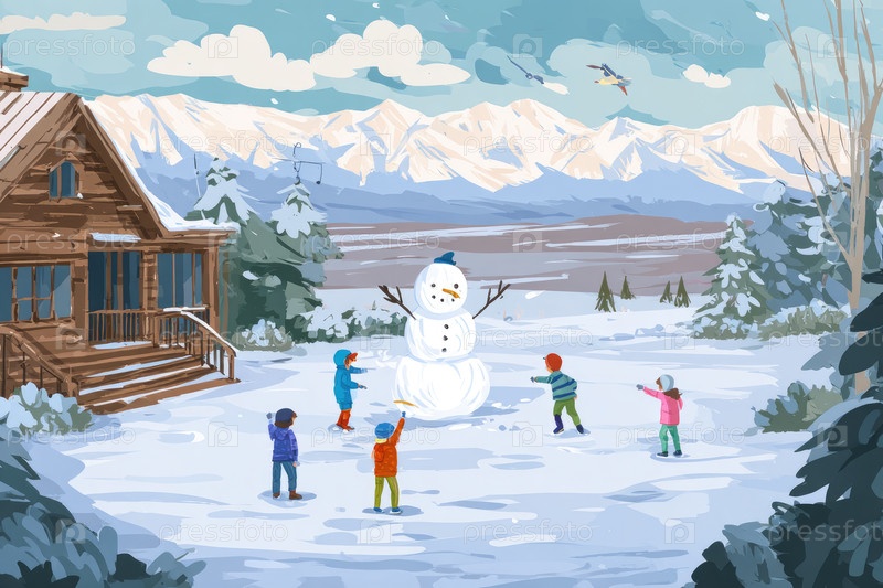 Дети счастливо строят снеговика в заснеженном пейзаже, окружённом высокими деревьями и горами с уютным деревянным домом на заднем плане, захватывая суть зимних развлечений и игр