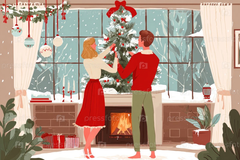 Пара счастливо украшает рождественскую елку внутри, в окружении праздничных декораций, и снег падает за окном, создавая теплую и уютную праздничную атмосферу