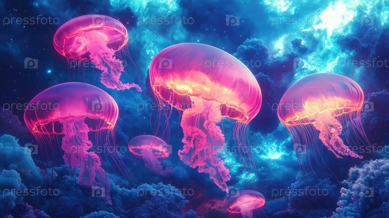 Яркая медуза грациозно плавает в космической подводной сцене с красочными светящимися эффектами