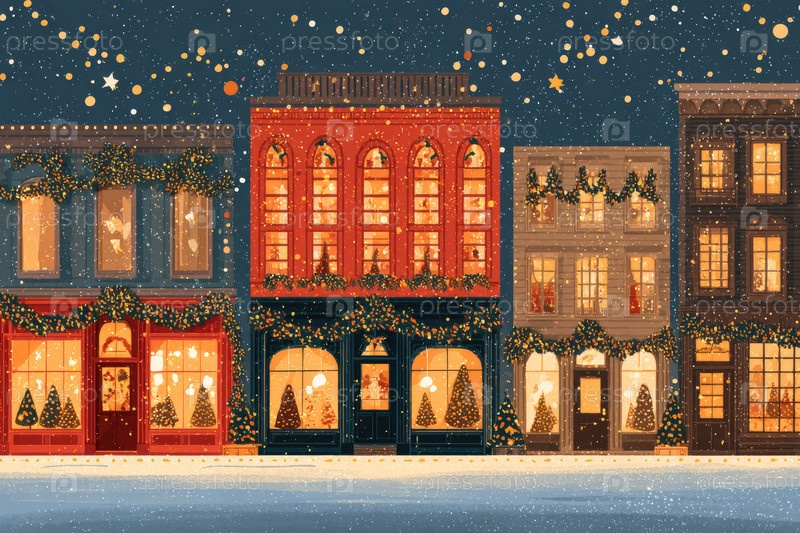 Красочная зимняя уличная сцена с праздничными украшениями и снежными зданиями ночью