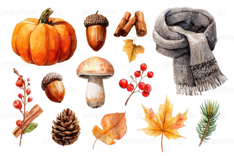 Осенняя тематическая акварельная иллюстрация с тыквами, желудьми и уютными аксессуарами для сезонного декора