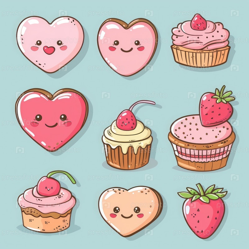 Милые десерты в форме сердца и кексы в стиле игры иллюстрации с яркими цветами