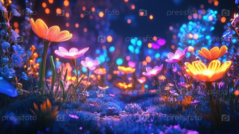 Яркие цветы светятся в волшебном саду с красочными огнями и очаровательной атмосферой