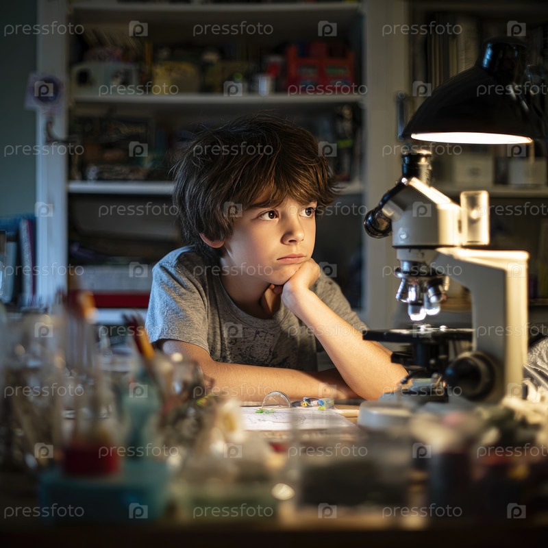 Маленький мальчик с коричневыми волосами пристально смотрит через микроскоп в загроможденное рабочее место, наполненное различными научными инструментами и материалами, демонстрируя любопытство и исследования науки