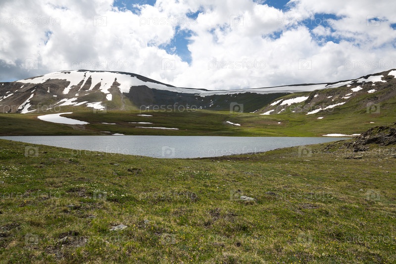 Красивый пейзаж горных хребтов, озер и заснеженных склонов
