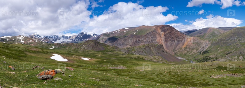 Панорама горных хребтов, ледников, заснеженных вершин и речной долины в Алтайских горах Сибири.Путешествия, исследование дикой природы