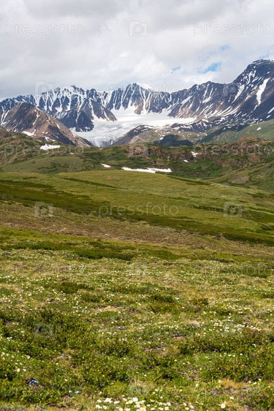 Потрясающий пейзаж горных хребтов, ледников, заснеженных вершин и зеленоватой травянистой долины с дикими цветами в пасмурный летний день в горах Алтая, Сибирь