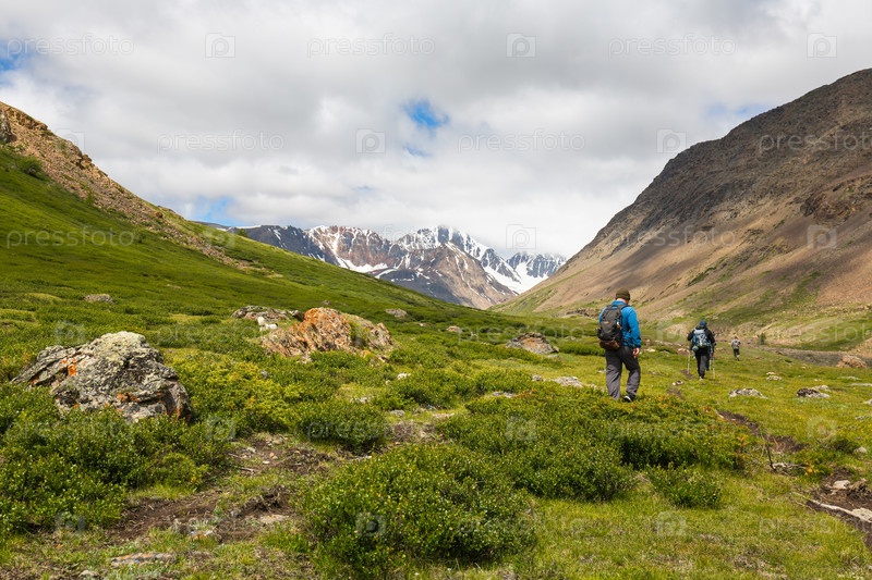 Группа туристов-путешественников спускается вниз по склону к заснеженным вершинам Алтайских гор, Сибирь, летняя прогулка и приключения, активный отдых