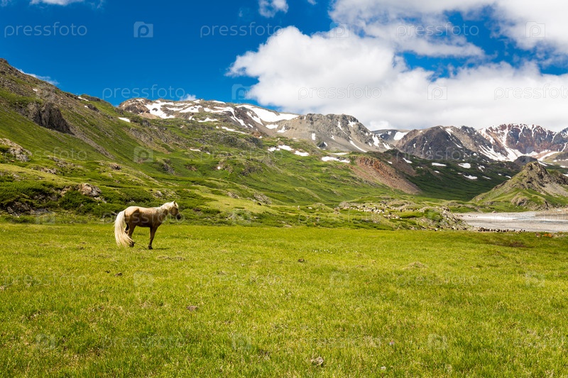 Красивые пейзажи зеленой долины и пастбищ для лошадей в пасмурный летний день на фоне скалистых гор Алтая, Сибирь
