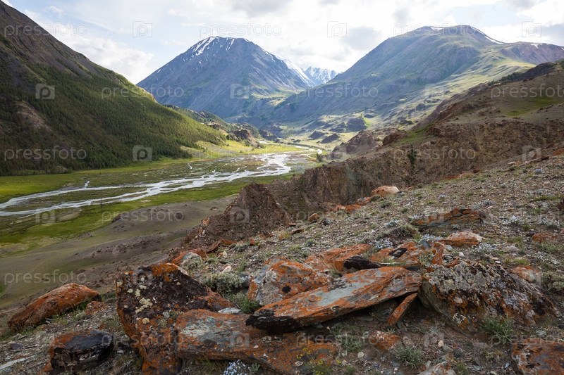 Пейзаж реки, протекающей из гор в зеленую долину в пасмурный летний день с заснеженными вершинами Алтайских гор на заднем плане
