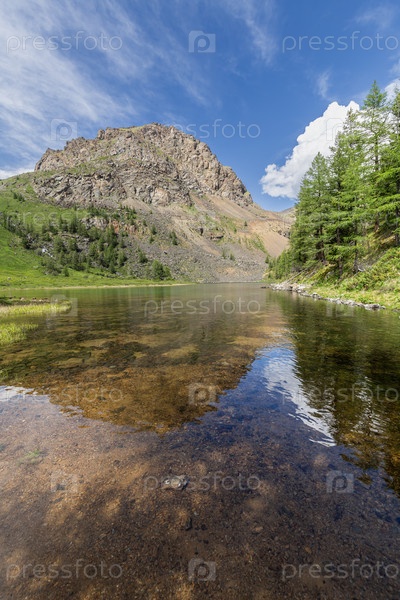 Пейзаж чистый, чистое горное озеро Куектанар в солнечный день против ларча и скалистых хребтов Алтая. летняя поездка в дикую сибирскую тайгу, походы и трекинг на природе
