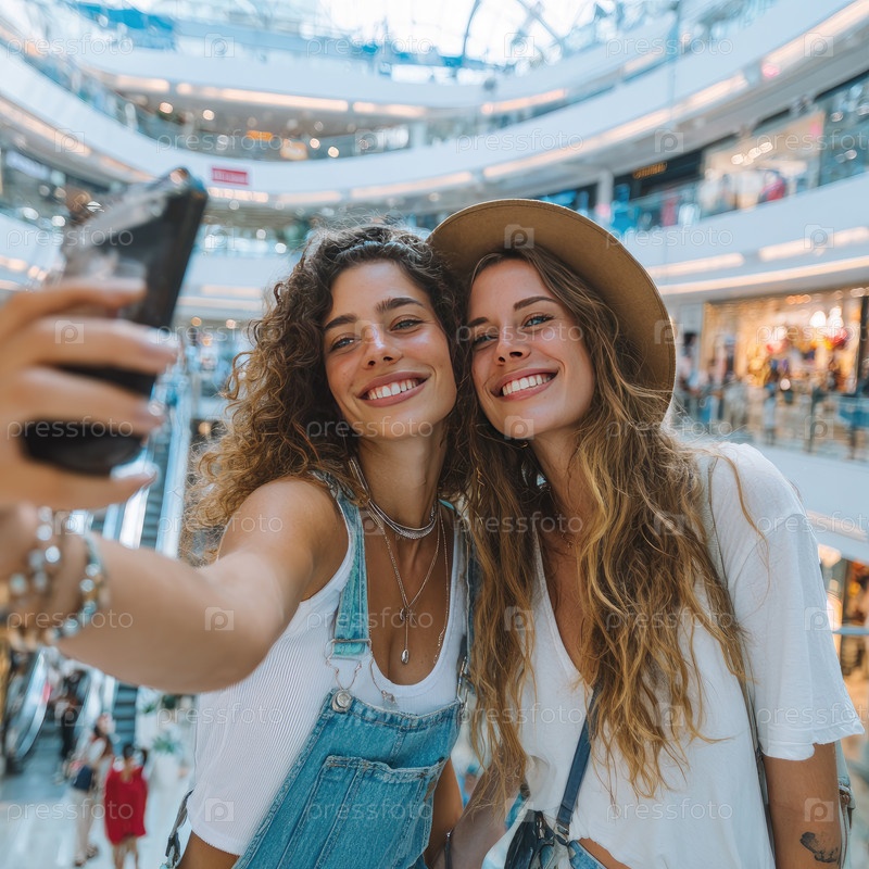 Две веселые женщины делают селфи в оживленном торговом центре, окруженные покупателями и яркими огнями, демонстрируя живую и современную розничную среду