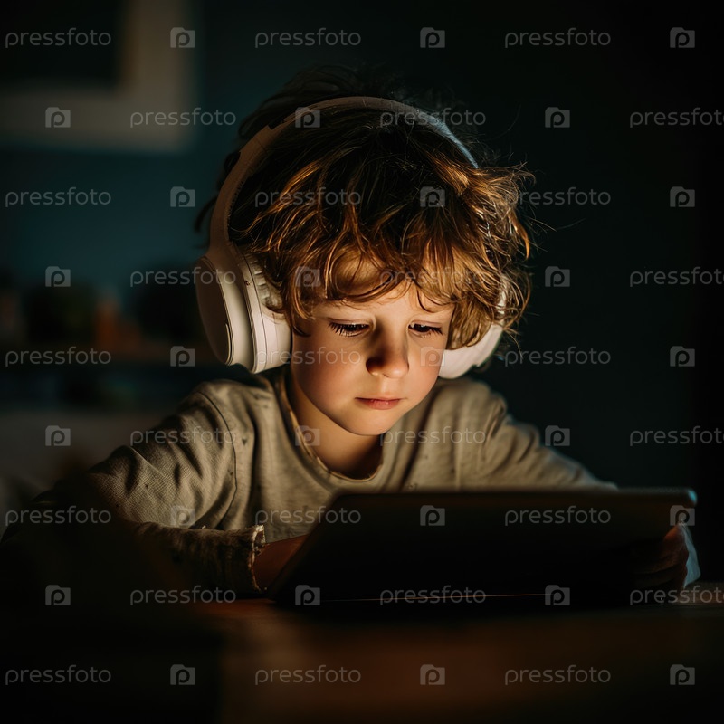 Маленький мальчик в наушниках глубоко занят экраном планшета в уютной помещенной среде, окруженный мягкими огнями и теплыми цветами, создавая спокойную атмосферу для обучения