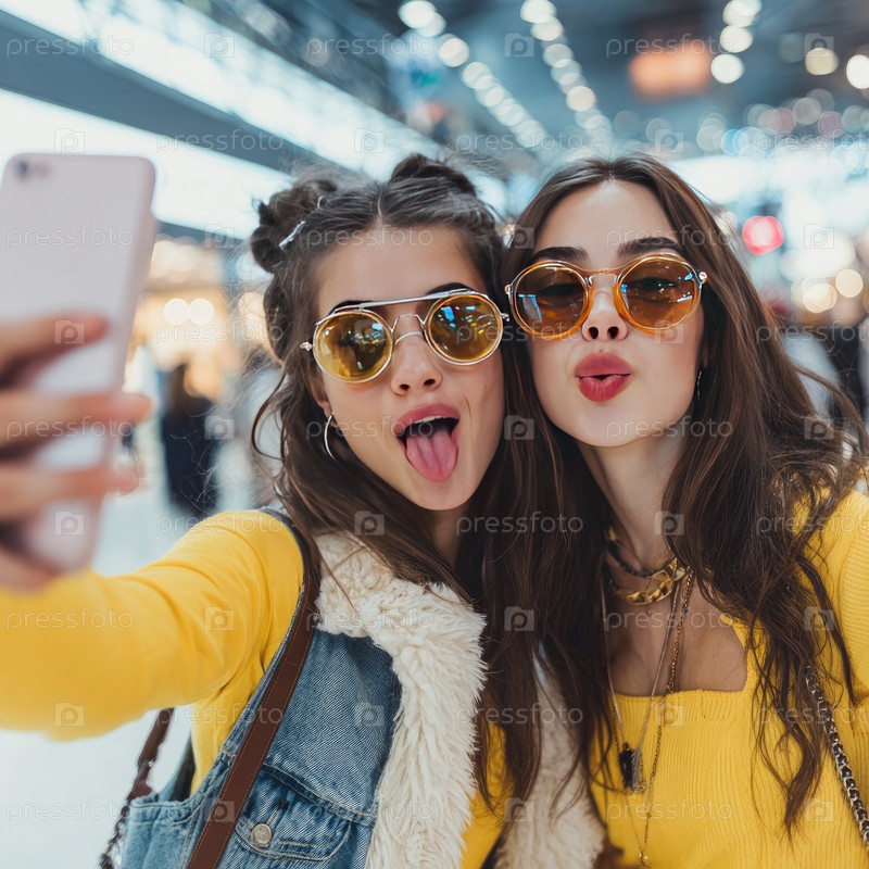 Две молодые женщины счастливо делают селфи в оживленном торговом центре, окруженные яркими огнями и красочными дисплеями, захватывая момент дружбы и веселья в шумной обстановке
