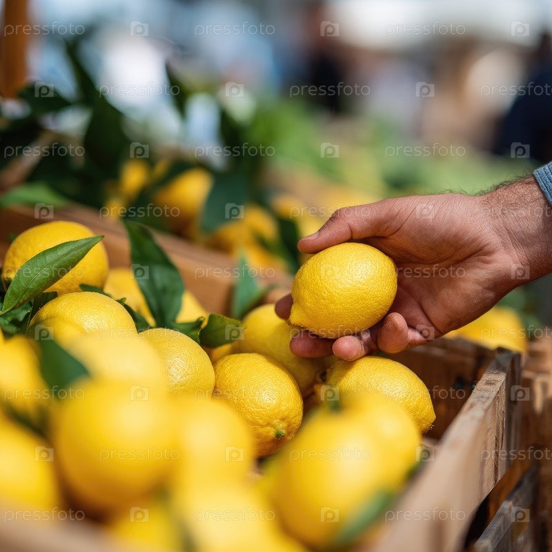Ручной подбор свежих лимонов в ярком рыночном киоске с деревянными коробками и зеленью