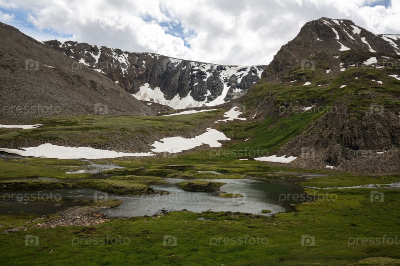 Вид на спокойную реку, протекающую через травянистую долину среди каменистых склонов гор Алтая, прекрасный летний пейзаж дикой природы, походы и путешествия