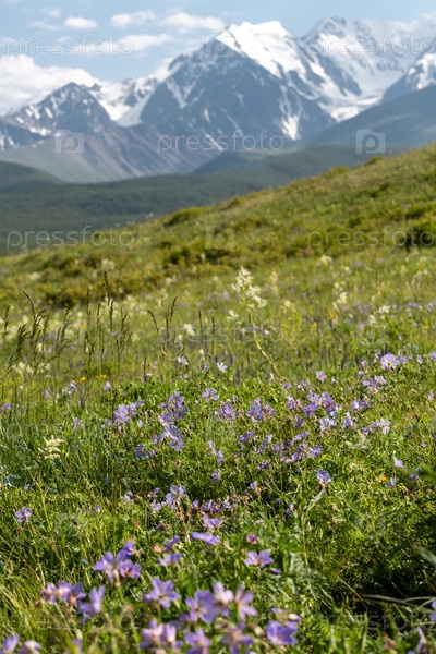 Поле диких цветов в зеленой травянистой долине в пасмурный день на фоне заснеженных вершин Альтайских гор, Сибирь.Путешествие в высокогорье, походы и знакомство с природой во время летних каникул