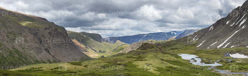 Панорамный вид на извивающуюся реку, протекающую из заснеженных гор в ярко-зеленую долину. Прекрасная сцена, идиллия, мир. Красота дикой природы в горах Алтая