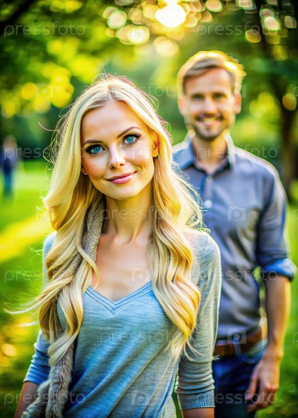 Блондинка улыбается на камеру, гуляя в парке с мужчиной