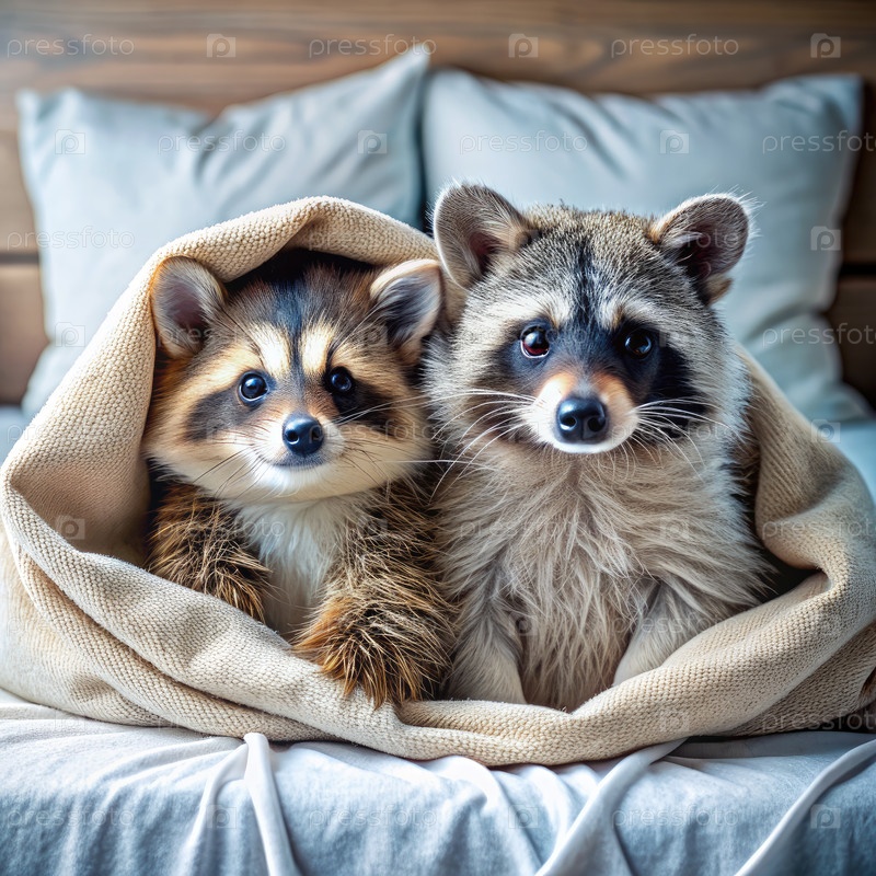Два енота отдыхают на кровати под одеялом