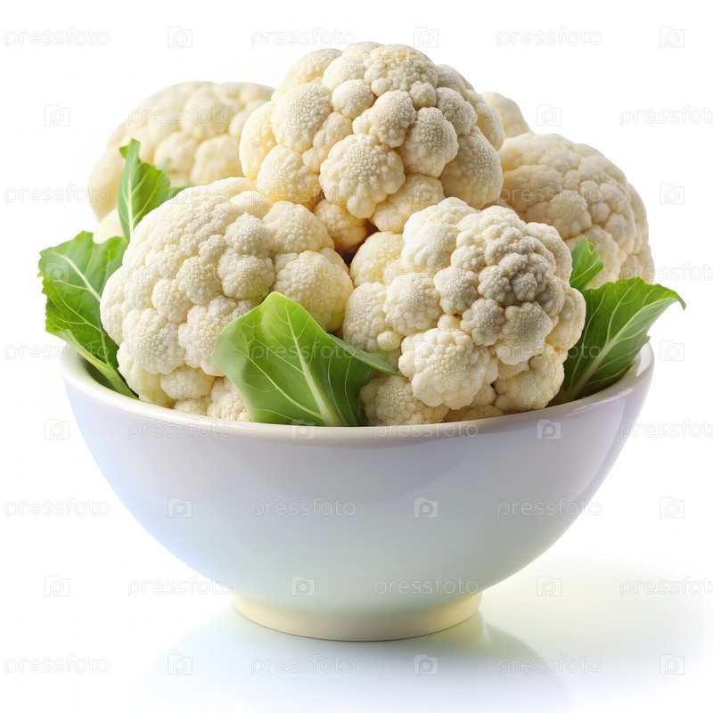 Белая чаша, заполненная цветной капустой на белом столе