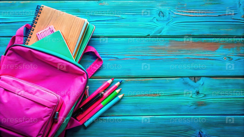 Розовый рюкзак с ручками, карандашами и ноутбуком на голубой деревянной поверхности
