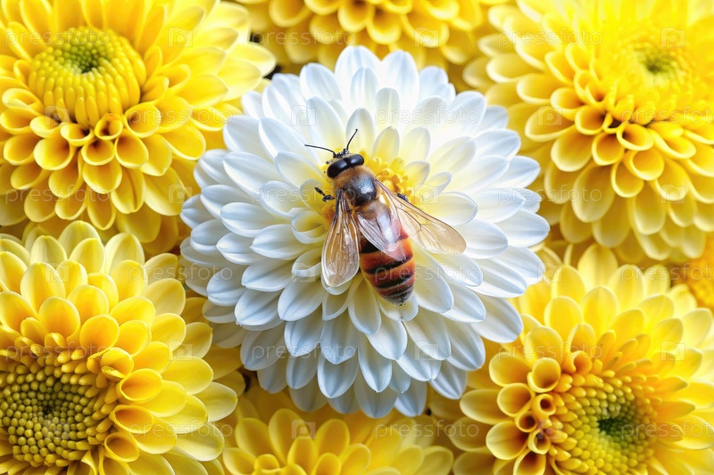 Пчела на бело-желтой хризантеме