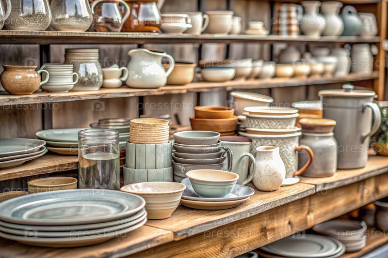Полка заполнена тарелками и чашками
