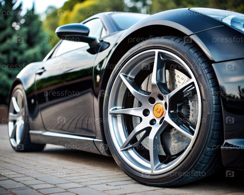 Черный спортивный автомобиль, припаркованный на кирпичной дороге