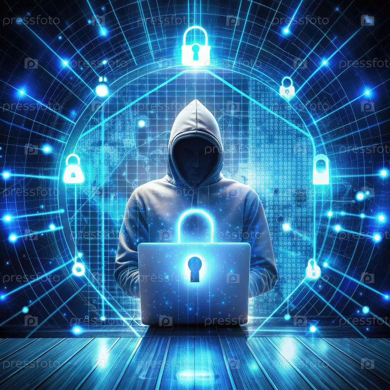 Человек, сидящий перед ноутбуком с замком. генерация ИИ