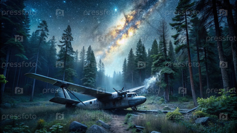 Заброшенный гидроплан под звездным небом в лесу