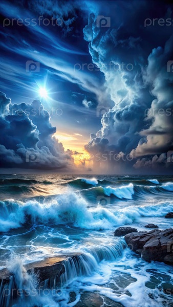Бурное ночное море с яркими облаками и драматическими волнами