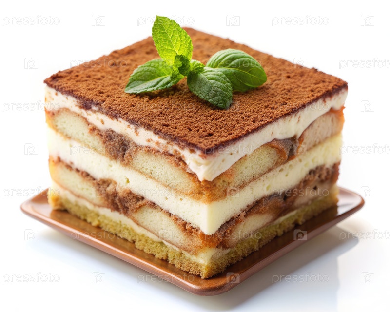 Одна порция вкусного тирамису на коричневой квадратной тарелке