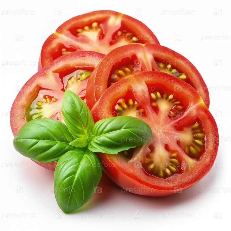 Свеже нарезанные помидоры с листом базилика на белом фоне